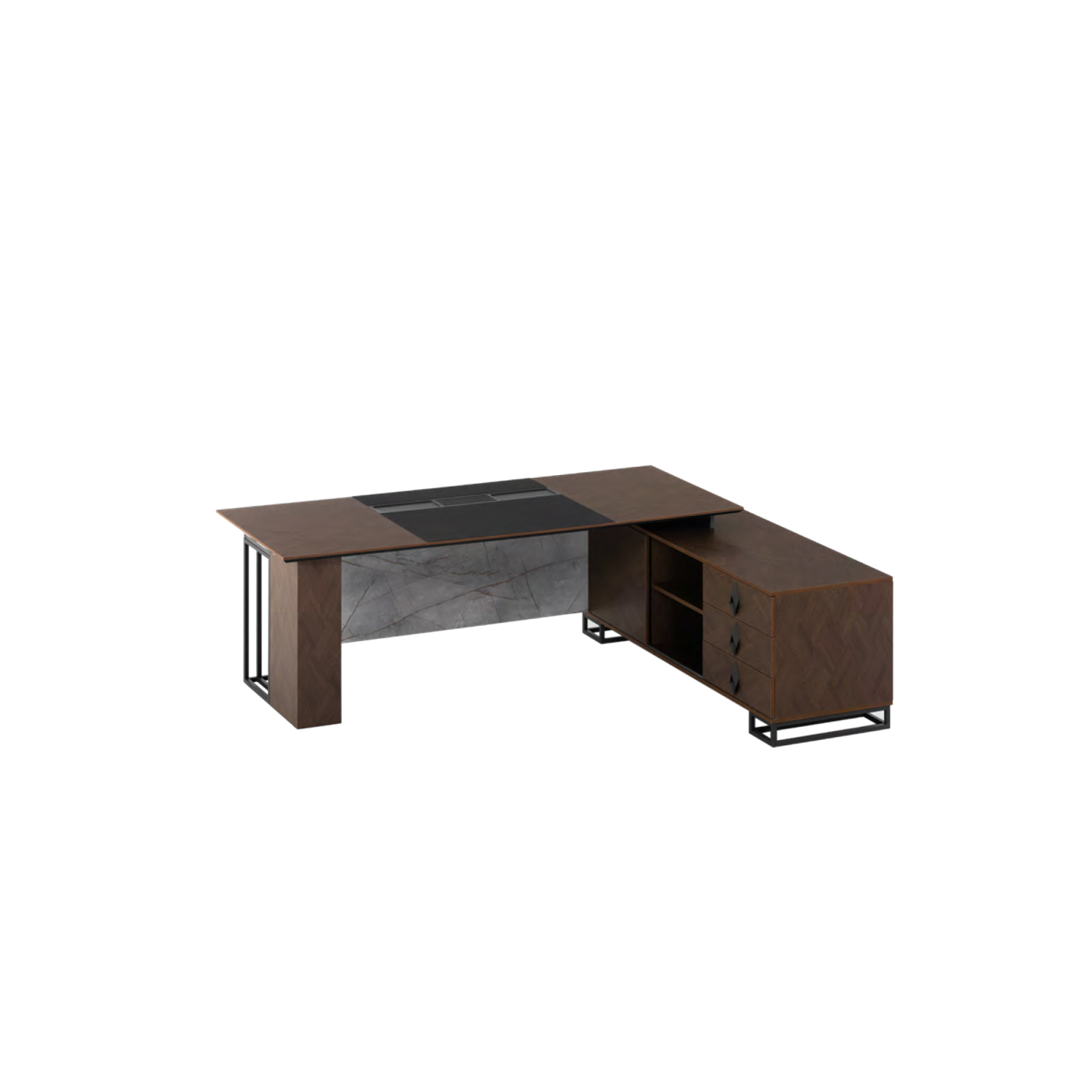 Set mobilier de birou, directoral, elegant-, Iin forma de L- PRIME confectionat din pal laminat cantuit PVC cu insertii din piele sintetica (la cerere si cu piele naturala) si picioare cu elemente metalice vopsite electrostatic. Culorile lemnului- disponibile mai multe nuante.