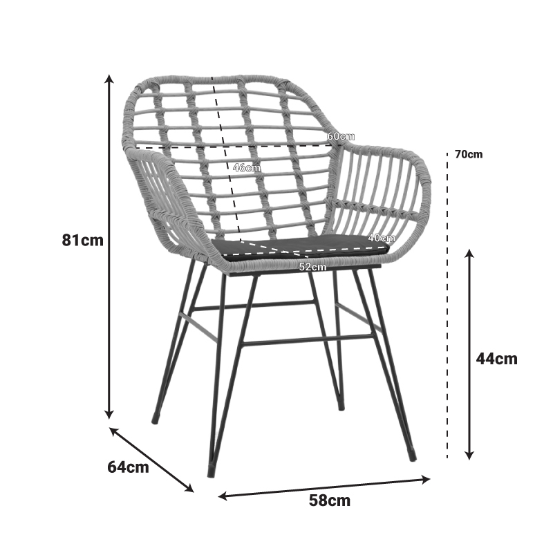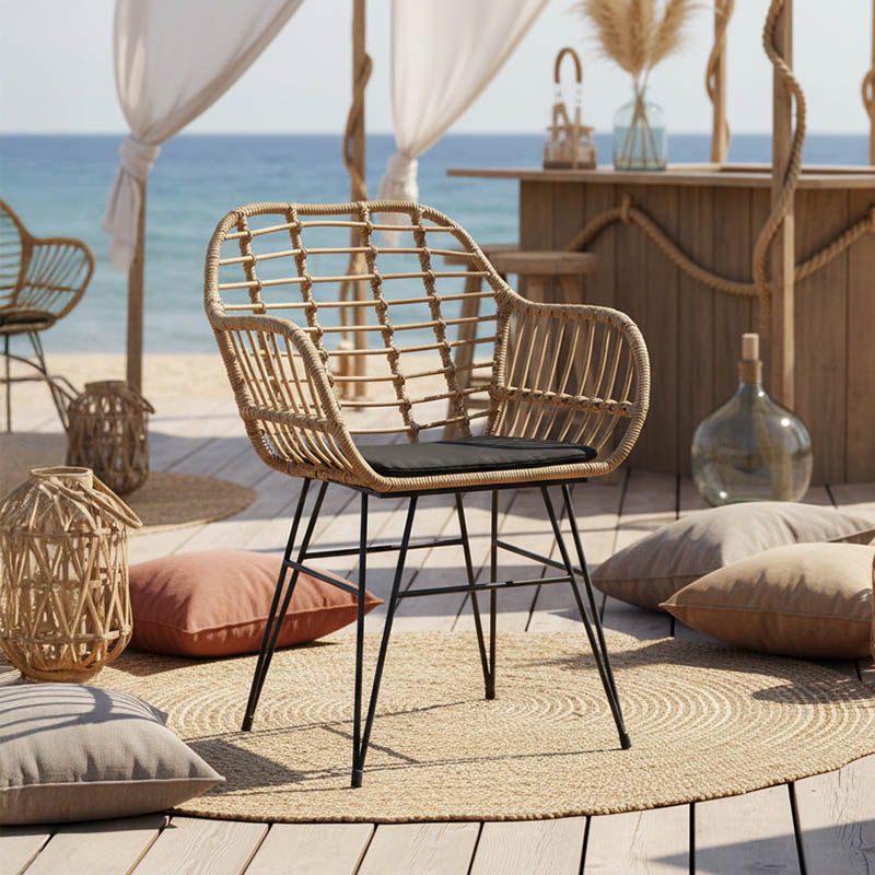 Suprafață fotoliu în principal din ratan PE. Ratanul PE este un tip de ratan sintetic ecologic, reciclabil și cu o durabilitate mai mare în comparație cu alte specii.