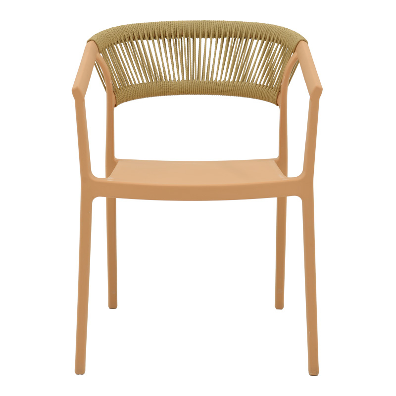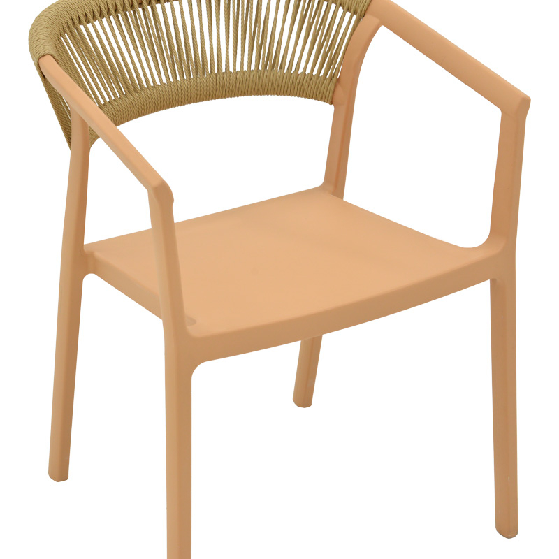 Spătarul este fabricat din ratan PE bej, creând o estetică caldă.